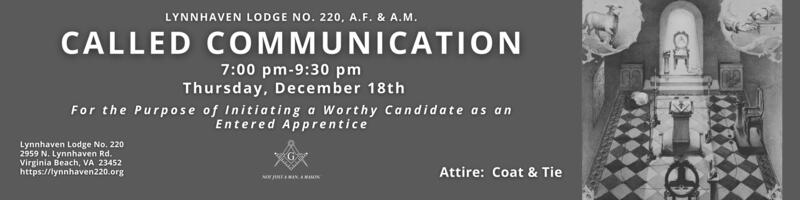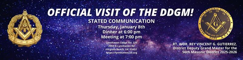 NOTE: This is the official website of Lynnhaven Lodge No. 220 of Ancient Free and Accepted Masons in the Commonwealth of Virginia. The information on this website is provided as a public service only and should not be used for commercial purposes. Unless otherwise explicitly stated, the material on this website is provided "as is" and without warranty of any kind. All express or implied conditions, representations and warranties, including any implied warrant of merchantability, fitness for a particular purpose, or non-infringement, are disclaimed. While it is our goal to keep this website accurate and current, no representations, warranties, or guarantees as to the quality, suitability, accuracy or completeness of any of the materials contained on this website are made. Please enjoy your visit to our website. If you have comments to help us improve this website, feel free to contact us at ecclessxii@gmail.com.