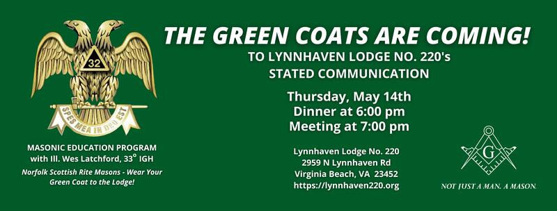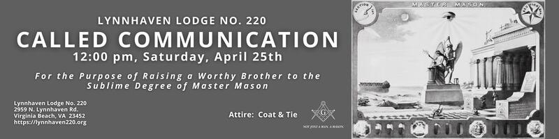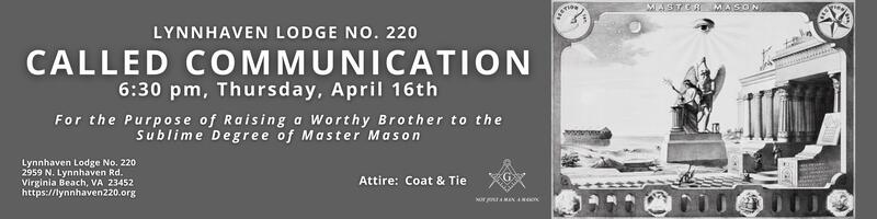 NOTE: This is the official website of Lynnhaven Lodge No. 220 of Ancient Free and Accepted Masons in the Commonwealth of Virginia. The information on this website is provided as a public service only and should not be used for commercial purposes. Unless otherwise explicitly stated, the material on this website is provided "as is" and without warranty of any kind. All express or implied conditions, representations and warranties, including any implied warrant of merchantability, fitness for a particular purpose, or non-infringement, are disclaimed. While it is our goal to keep this website accurate and current, no representations, warranties, or guarantees as to the quality, suitability, accuracy or completeness of any of the materials contained on this website are made. Please enjoy your visit to our website. If you have comments to help us improve this website, feel free to contact us at ecclessxii@gmail.com.